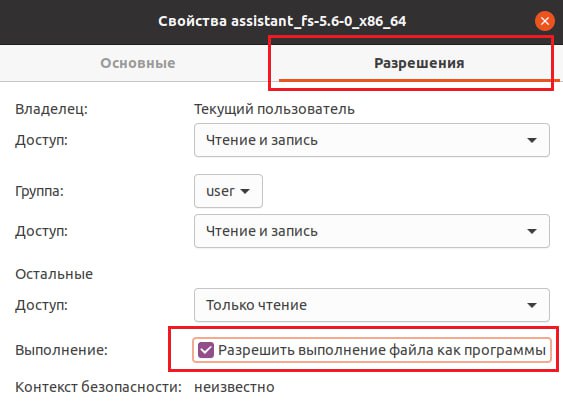 В открывшемся меню «Свойства assistant_fs_ris» перейдите на вкладку «Разрешения» и поставьте галочку «Разрешить выполнение файла как программы» в пункте «Выполнение», затем закройте свойства
